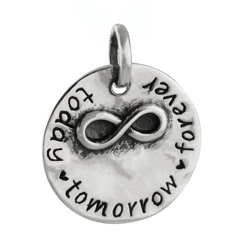 - Pendant is engraved with the words "today, tomorrow, forever" with a small heart between each word